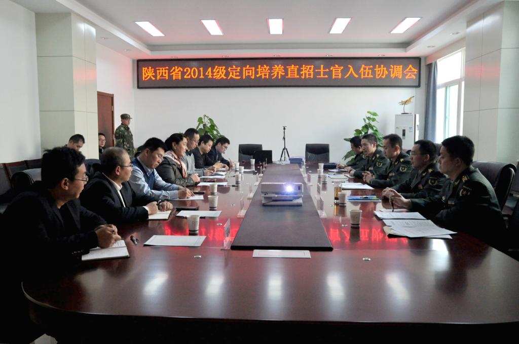 12月8日下午,我校2014级定向培养直招士官入伍协调会在阎良校区召开,校党委副书记谭少敏,省军区军务动员处处长吕森,西安警备区参谋长王巨礁,阎良区武装部政委周立文,我校招生就业处、教务处、士官学院负责人参加了本次会议,会议由吕森主持。工作组一行首先实地考察了士官学院的建设情况,详细了解了学院的军营文化宣传、士官生公寓管理等情况,随后参观了我校校史馆、航空馆。