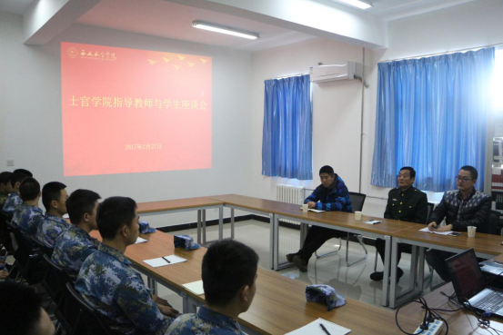 2017年2月27日,士官学院指导教师李新建老师与学生代表在我院3301图书阅览室进行了座谈。出席座谈会的有团总支书记李亚胜、教官张亚峰及各班学生代表。