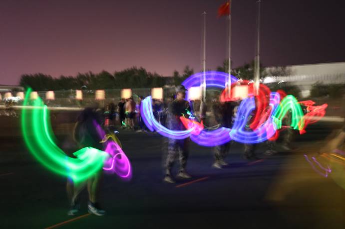 活动伊始,各个学院为大家带来精彩的开场舞和青春昂扬的歌曲,点燃了全体参与师生的热情。本季“耀动你心”荧光夜跑活动在沿袭上季经验的基础上,又添加了荧光T恤DIY趣味环节,同学们把奇思妙想和情感表达借助荧光笔绘制在白色T恤上,化身为一个个与众不同、荧光闪闪的“小精灵”,吸引无数路过同学的驻足观看。在准备工作完毕后,随着学生处副处长赵琳老师发出开始指令,500余名参与者一起出发,戴着荧光头饰、手握荧光棒将操场点缀成荧光的海洋。本次活动规则为每跑一圈进行一项娱乐游戏,娱乐游戏有“舞动我青春”、“运动我快乐”“有胆来突破”“默契大考验”等四项活动,四项活动完成后,进行最终评分,用时最少者获胜。活动结束后,大家纷纷表示此次“耀动我心”荧光夜跑活动,让自己感受到了青春运动的魅力与活力。