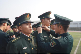 大会第二项,由大二入党积极分子为新生佩戴标识。新生深知此时他们肩上扛的不仅是一道杠,而是属于士官生的使命与担当。