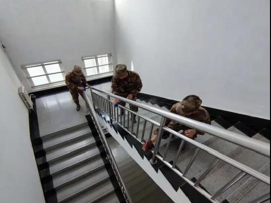 在打扫卫生过程中,士官生针对楼体拐角、教学楼以及宿舍楼梯扶手进行擦拭干净,在宿舍楼的小花园中对竹林等处清理垃圾。在图书馆中针对书架和落灰的书籍用干毛巾清除灰尘,以及餐厅出入口进行卫生打扫。