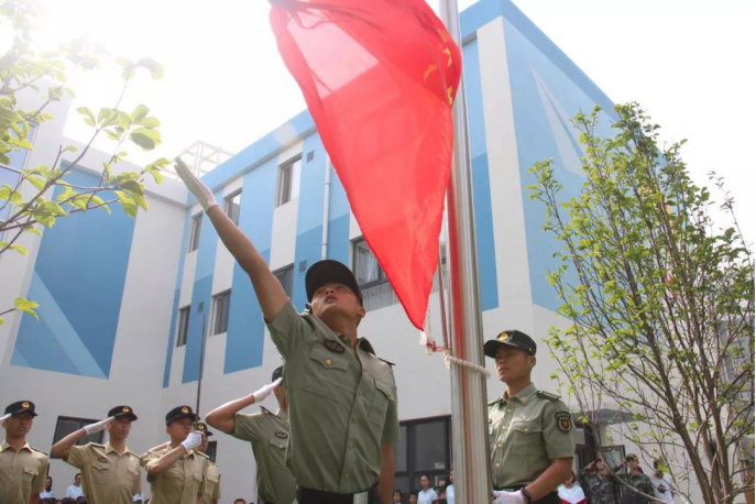 9时整,士官学员七名护旗手,迈着铿锵有力的步伐,昂首阔步护卫着五星红旗步入升旗台,随着一声铿锵有力的“敬礼!”,鲜艳的五星红旗在雄壮的《中华人民共和国国歌》声中冉冉升起,在朝阳的辉映下迎风飘扬。在这庄严时刻,参加升旗仪式的全体士官生和师生们精神抖擞,饱含着对伟大祖国的无限热爱之情油然而生。