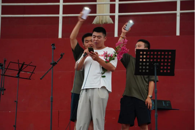 中场环节,只听“教官,来一个!教官,来一个!”随着同学们的起哄,平日里总是严肃的教官此刻也是走上了舞台,要说姜还是老的辣,教官们引吭高歌,神采飞扬,全场呐喊声不断,更有不少歌迷与教官同台歌唱,献上鲜花。晚会被成功推上了高潮。