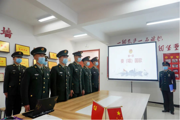 会议伊始,全体起立奏唱国歌。随后,主持人宣读五名新发展的团员名单。