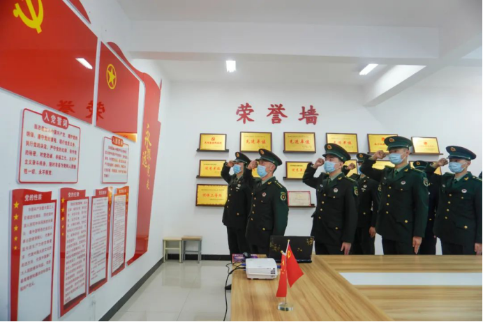 “买球赛十大平台优秀共青团员标兵”、士官学院学生分会主席团成员李涛面向团旗带领新团员宣誓、老团员重温入团誓词。