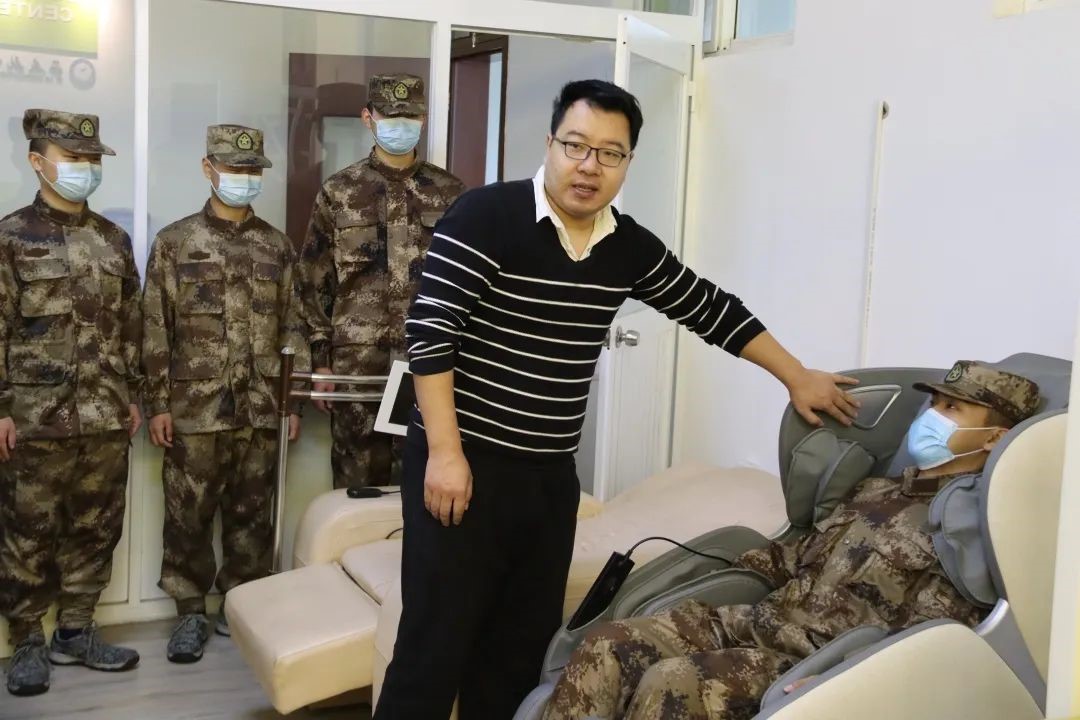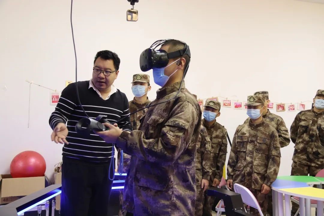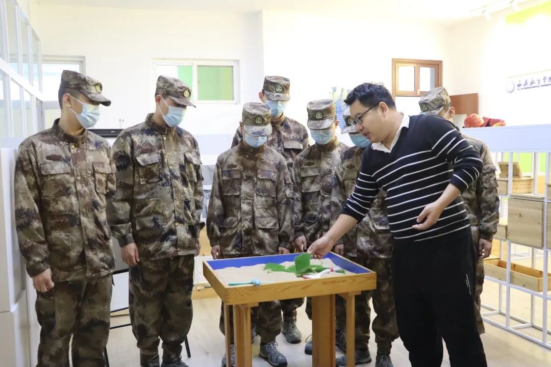 陈文博老师向大家详细讲述心理咨询中心的主要职责与功能。讲解中,心理护航员有序体验了四个区室的设施,分别是沙盘游戏、按摩椅、运动发泄、VR项目体验。随后,学员们通过相关设备的体验,来缓解近期训练带来的疲劳,并得到心理压力的释放。