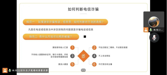 各班以线上会议的形式开展主题班会。会议中各班长以身边的具体案例带领学员了解电信网络诈骗的危害,有针对性的向学员们介绍了电信诈骗的不同形式与一般过程,并让学员们就诈骗案件发生的主观、客观原因进行了探讨与交流,提出一些可行的有效的防诈骗方法和原则。会后,班长再次警示大家做到不轻信来历不明的电话和短信,不点开陌生链接,不透露自己及家人信息,不贪图小便宜,不参与刷单返现、扫码赠品等涉诈活动,遇到电信诈骗要保持冷静及时上报,学会用法律武器保护自己的合法权益,以减少乃至杜绝电信诈骗的发生。