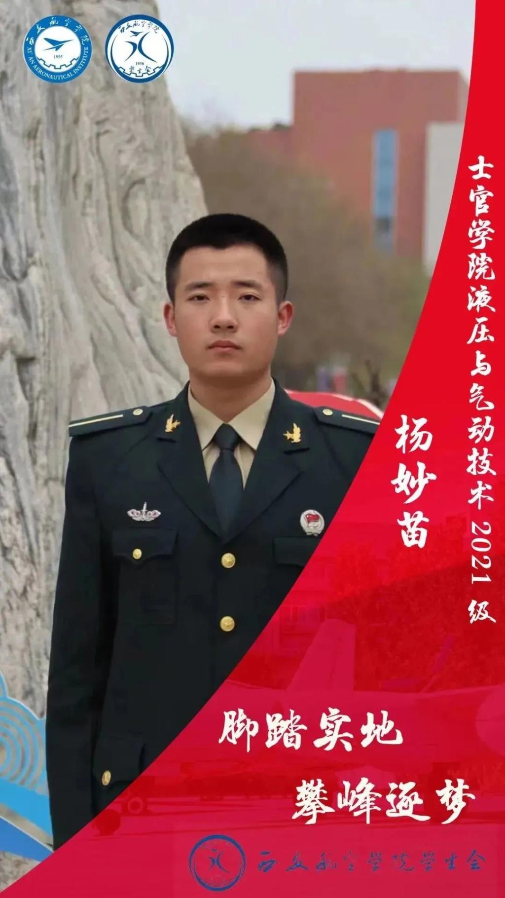 杨妙苗,男,共青团员,液压214D班。现担任班长。在校期间,个人在校表现出色,工作态度认真,并且耐心十足,积极配合学院工作,紧抓队列训练,并出色完成各项任务。在校期间,获得军训“优秀学员”称号,参与2022年士官学院暑期三下乡“寻找老兵,宣扬红色精神”社会实践活动。荣获2021-2022学年国家励志奖学金。