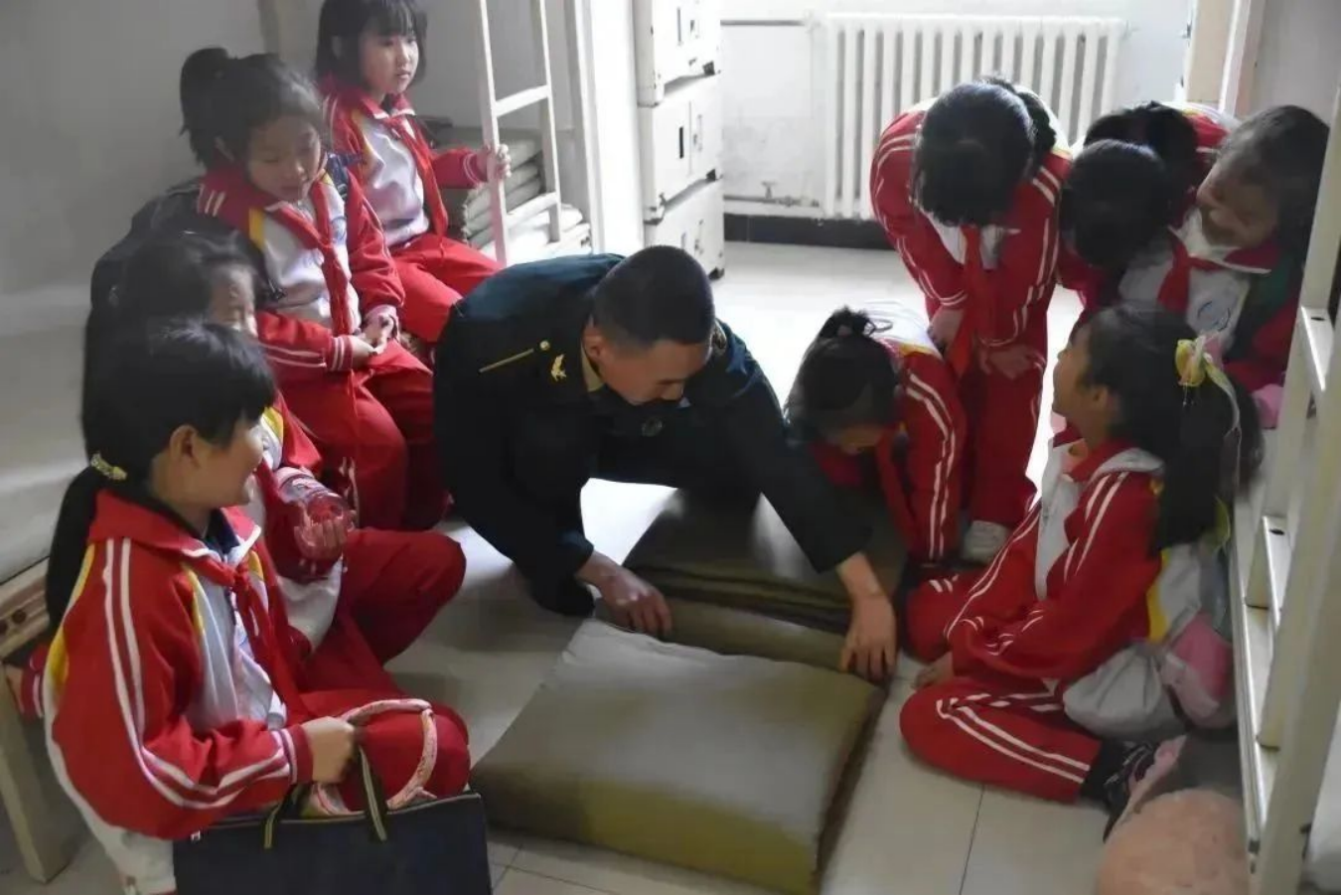 为满足孩子们的好奇心,学员志愿者为孩子们现场展示、讲解叠被子的步骤及方法。学员志愿者干净利落、一丝不苟,为孩子们树立一个良好的榜样形象。