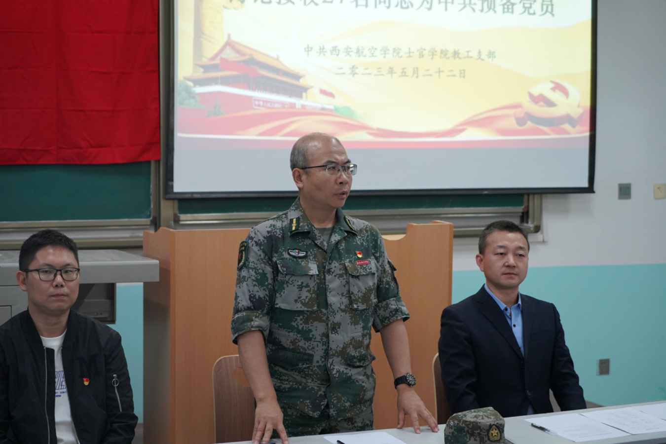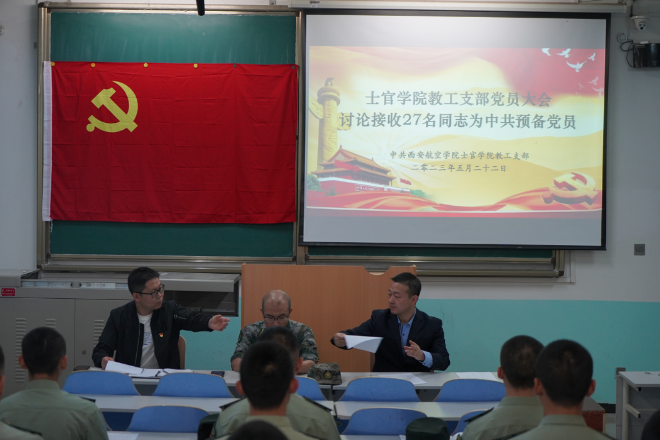 士官学院于2023年5月22日在阎科楼158教室召开党员大会,讨论刘统鑫等27名发展对象发展为中共预备党员相关事宜。会议由士官学院教工党支部书记来东主持,同时出席本次会议的有士官学院党总支副书记李庆、教工党支部宣传委员兼纪检委员赵炫儒,全体发展对象参加了会议。