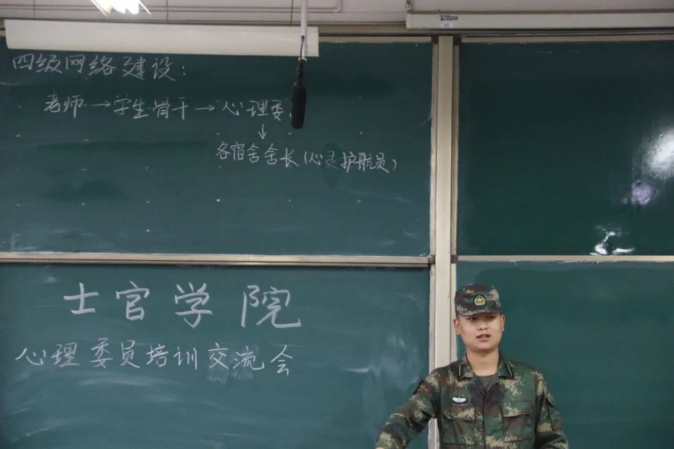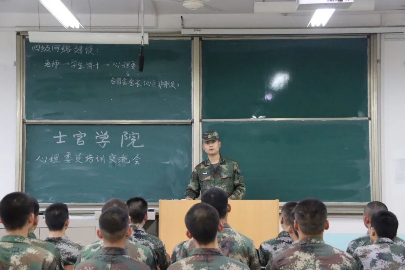 了解心理健康相关知识后,白洋洋讲述士官学院四级网络建设逐层管理,由各宿舍舍长、各班心理委员注重每一个军士学员身心健康建设,早发现,早预防,早上报。