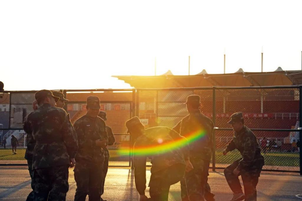莫道桑榆晚,为霞尚满天。日落,是实训中最美的一幕。夕阳西下,余晖洒在东训场上,学员们感受时间与光的流逝。余霞成绮,这瑰丽的光芒,是奋斗的样子。大家脸上溢着自豪的笑容,回首过去的日子,感慨万分:汗水不止一次滴落在这片训练场上,每一次奋力地跳跃、奔跑,都是为成为一名真正军人的誓言。只有饱受磨砺,才能向更高的目标迈进。