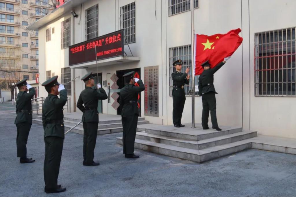 随着庄严的国歌响起,学员们迈着坚定的步伐走向国旗台,亲手将国旗冉冉升起。伴随着国歌的旋律,国旗在晨光中迎风飘扬,展示着国旗的无上威严与荣光。在场的社区居民们纷纷肃立,以注目礼向国旗致以最崇高的敬意和对国家的热爱。