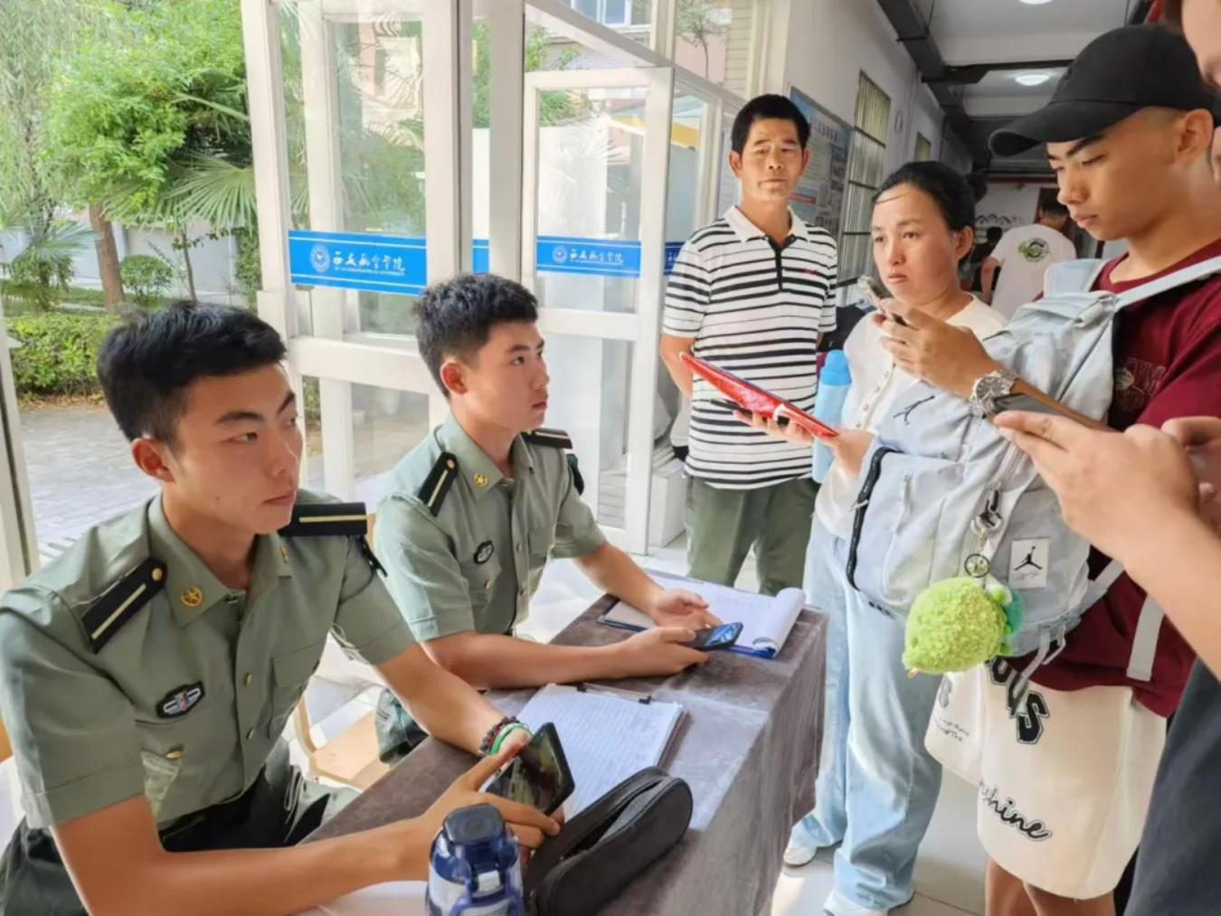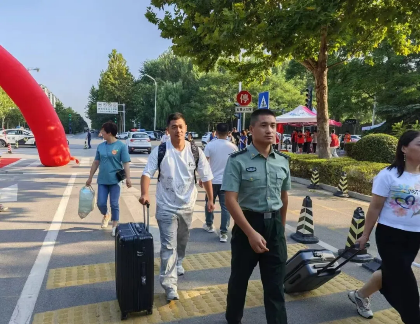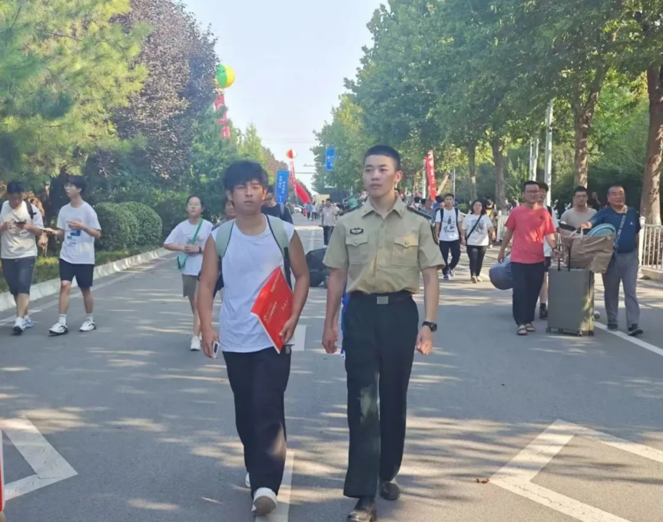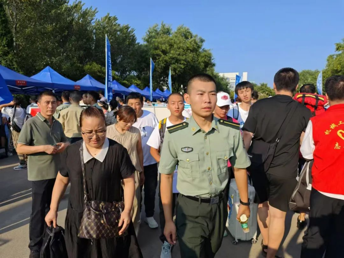 8月31日,负责迎接的学员志愿者们着装整齐,军姿挺拔,在学校大门口处顶着灼灼烈日,等待着新学员们的到来。