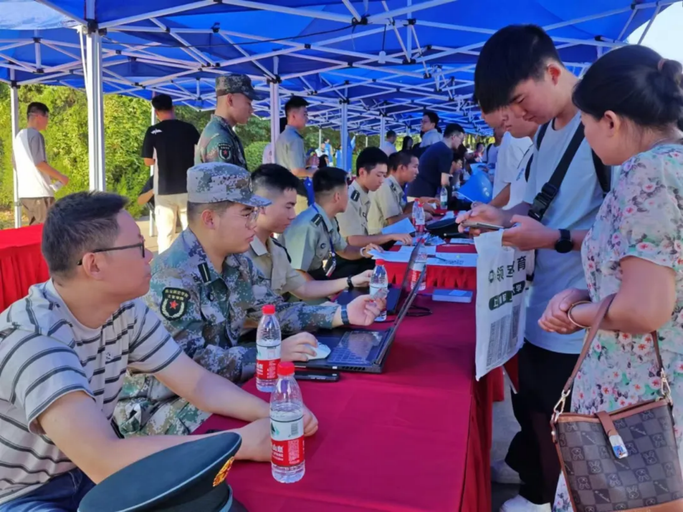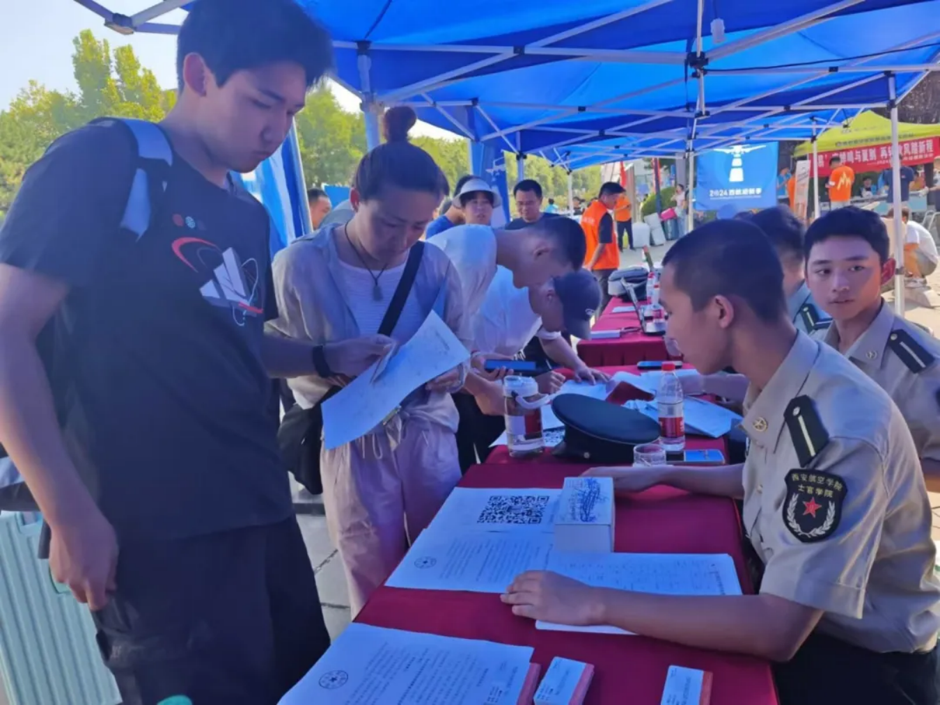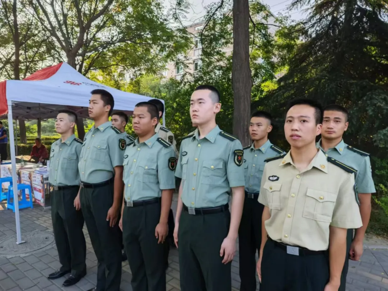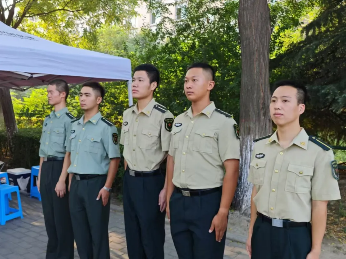 8月31日,负责迎接的学员志愿者们着装整齐,军姿挺拔,在学校大门口处顶着灼灼烈日,等待着新学员们的到来。
