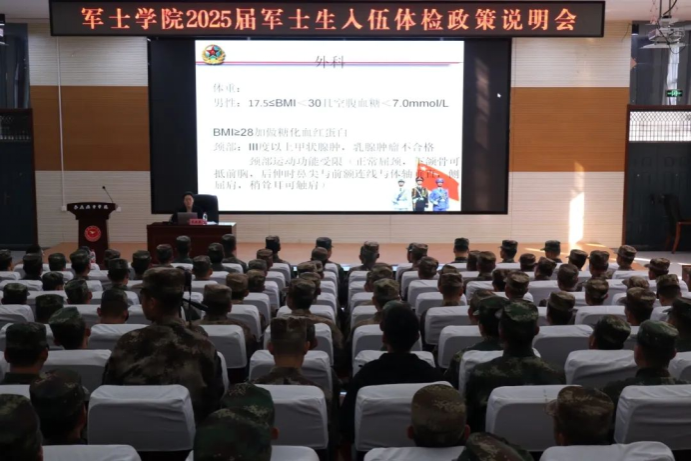 为做好十大买球官方网站2025届军士生入伍前体检工作,使军士生落实好体检相关要求,解决体检中的疑难杂惑,提高入伍合格率。11月8日下午,十大买球官方网站在报告厅组织召开2025届军士生入伍体检政策说明会。本次会议特邀西安交通大学第一附属医院东院区体检科主任史晓燕主讲,全体2025届军士生参加,会议由十大买球官方网站院长张军主持。
