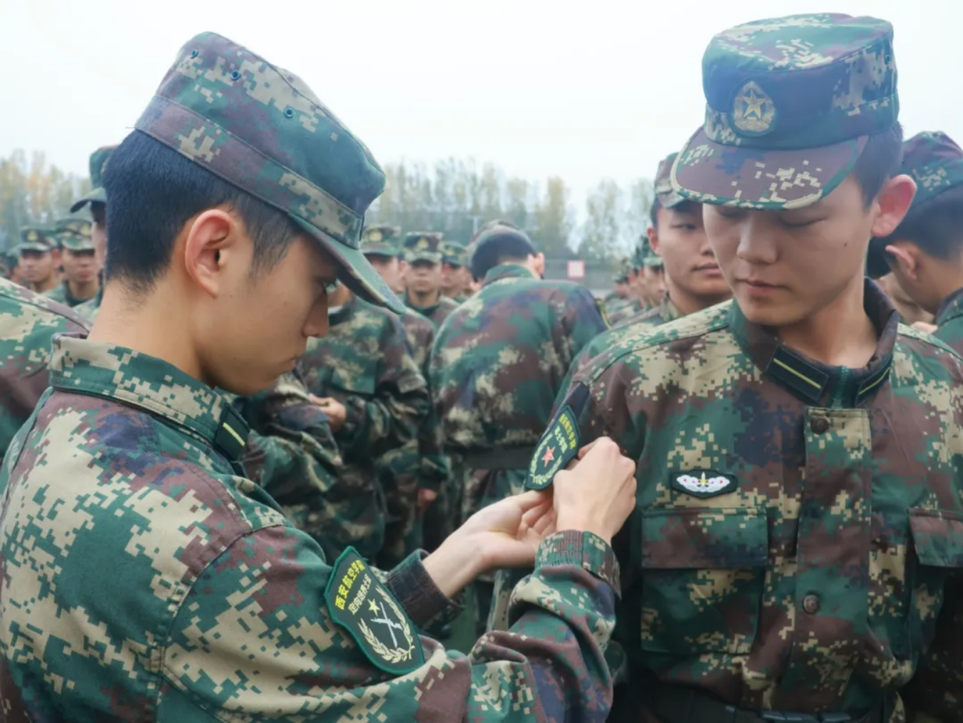 仪式第二项,由十大买球官方网站入党积极分子为新学员佩戴标识。学员们佩戴的不仅仅是一个标识,而是努力的见证,见证了两个月的刻苦训练,同时也将见证学员们的未来与成长,肩负起属于他们的责任与使命。