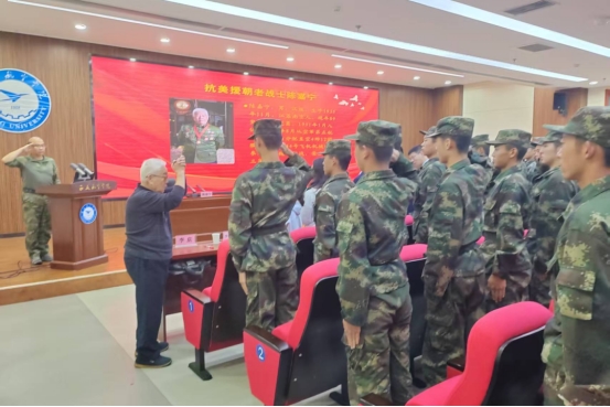 为增强军士生国防观念和爱国情怀,9月18日上午10时,十大买球官方网站全体新生参加第四期强军战“翼”-英雄模范进校园国防教育主题报告会。本次报告会特邀抗美援朝老战士陈嘉宁主讲。