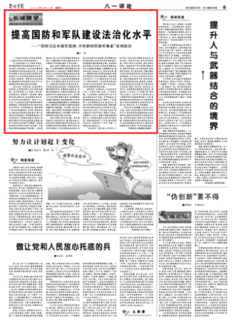 严治之军,所向披靡;无治之兵,百万无益。站在人民军队建军95周年的时间节点上,身后是我军法治建设征途上的光辉足迹,眼前是实现强军目标的时代召唤。全军部队要深入贯彻习近平强军思想,不断提高国防和军队建设法治化水平,把我军锻造成为律令如山、能打胜仗的精兵劲旅,向党和人民交出合格答卷。